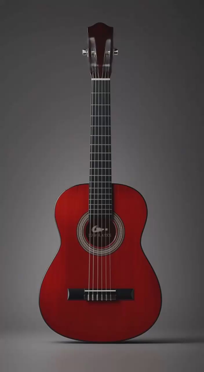 A 39" classical guitar with a linden body, okoume neck, and nylon strings, finished in gloss red — ideal for beginners and casual players looking for warm, mellow tone.